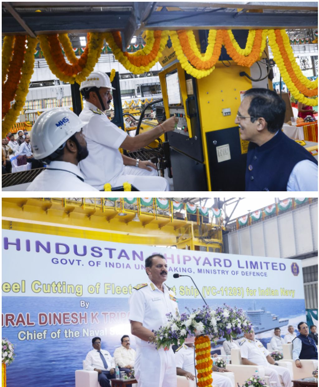 Steel Cutting’ ceremony of fourth of the five Fleet Support Ships (FSS) was held at Hindustan Shipyard Limited (HSL) on 19 Jun 2025, in presence of Adm Dinesh K Tripathi, Chief of the Naval Staff as the Chief Guest. VAdm Rajesh Pendharkar, Flag Officer Commanding-in-Chief, Eastern Naval Command, VAdm Rajaram Swaminathan, CWP&A, Cmde Hemant Khatri CMD HSL, and other senior officials from Indian Navy and HSL were present for the occasion. The Indian Navy had signed a contract with HSL for acquisition of five Fleet Support Ships (FSS) in Aug 2023, with delivery commencing…